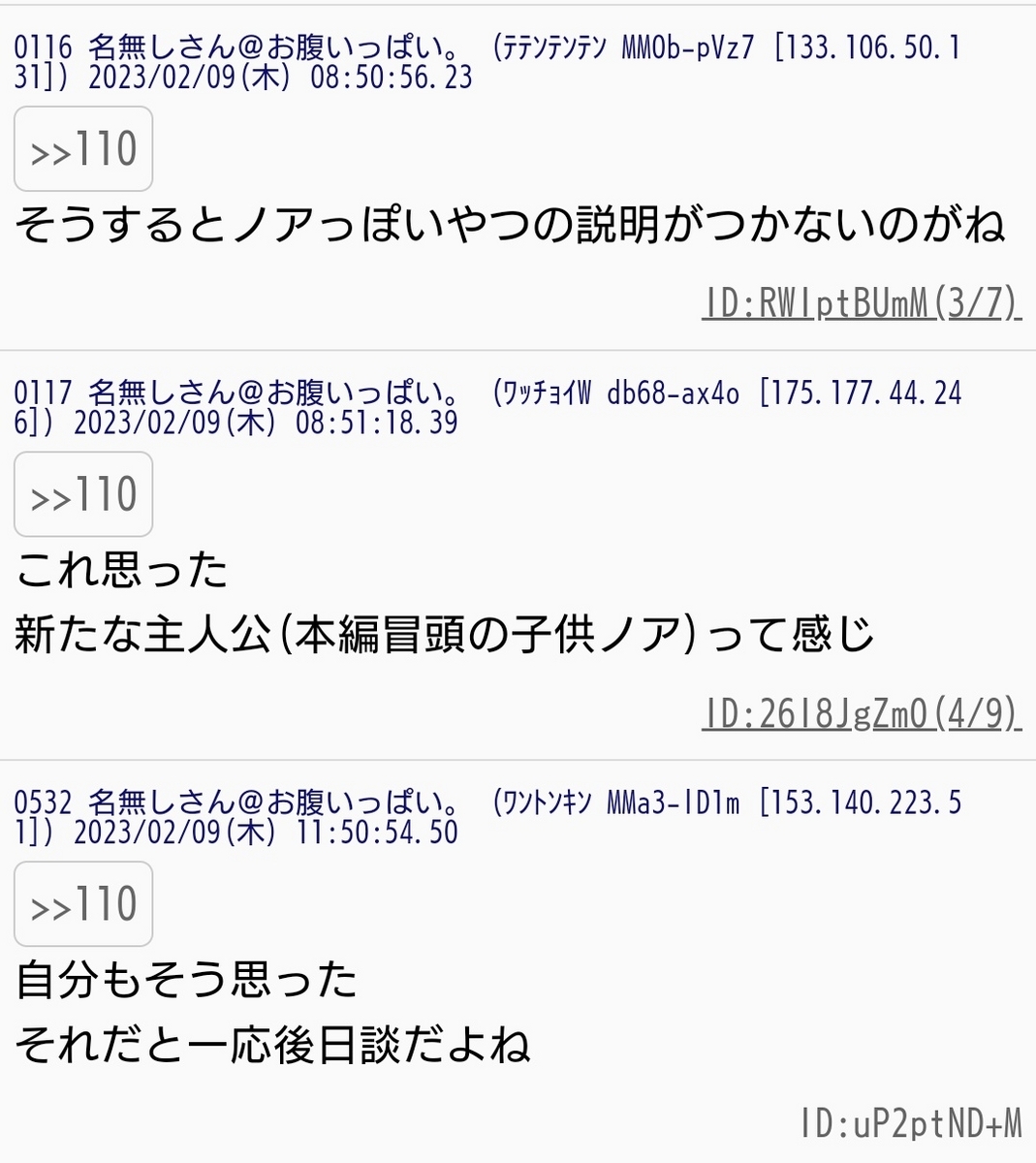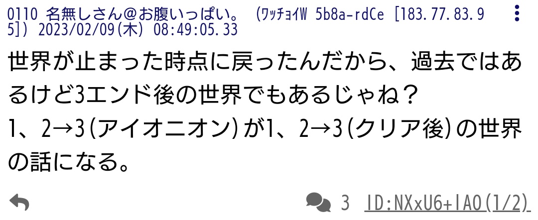 ちなみにまとめサイトやTwitterを見ると、いまだに前日談か後日談か分かれていますね。Twitterでも共有しましたが、掲示板にて書かれた説は中々に面白いのでブログの方でも貼っておきますね。